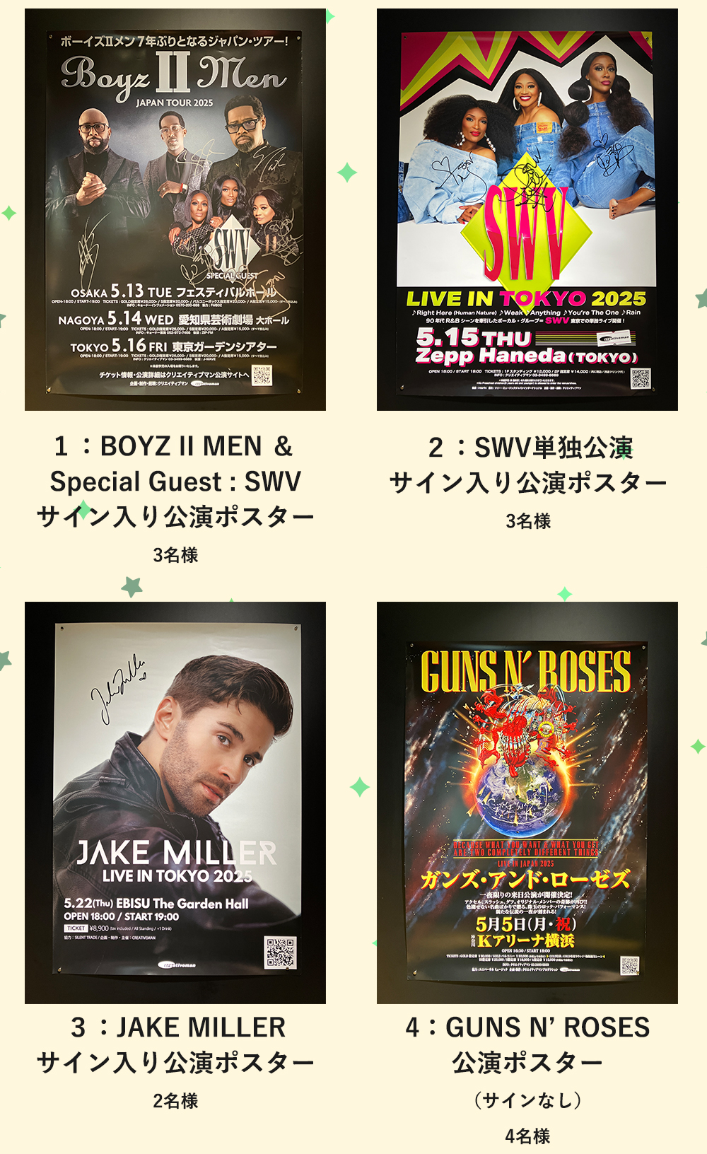 5月に開催された来日公演より、BOYZ II MEN w/Special Guest: SWV、 SWV (単独公演)、JAKE MILLER の貴重なアーティスト直筆サイン入りポスター(非売品)、
